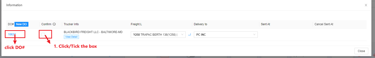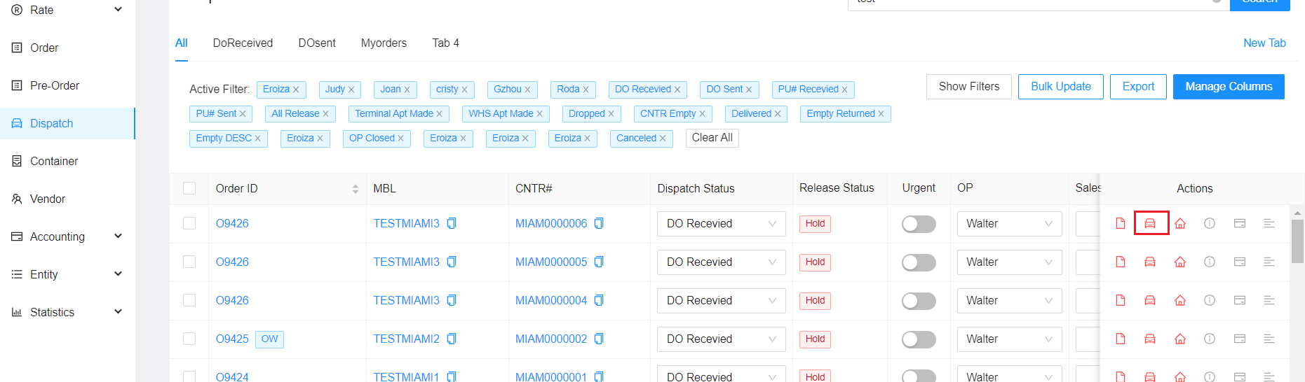 2. Go to Dispatch Tab and select the little car icon of the container naumber