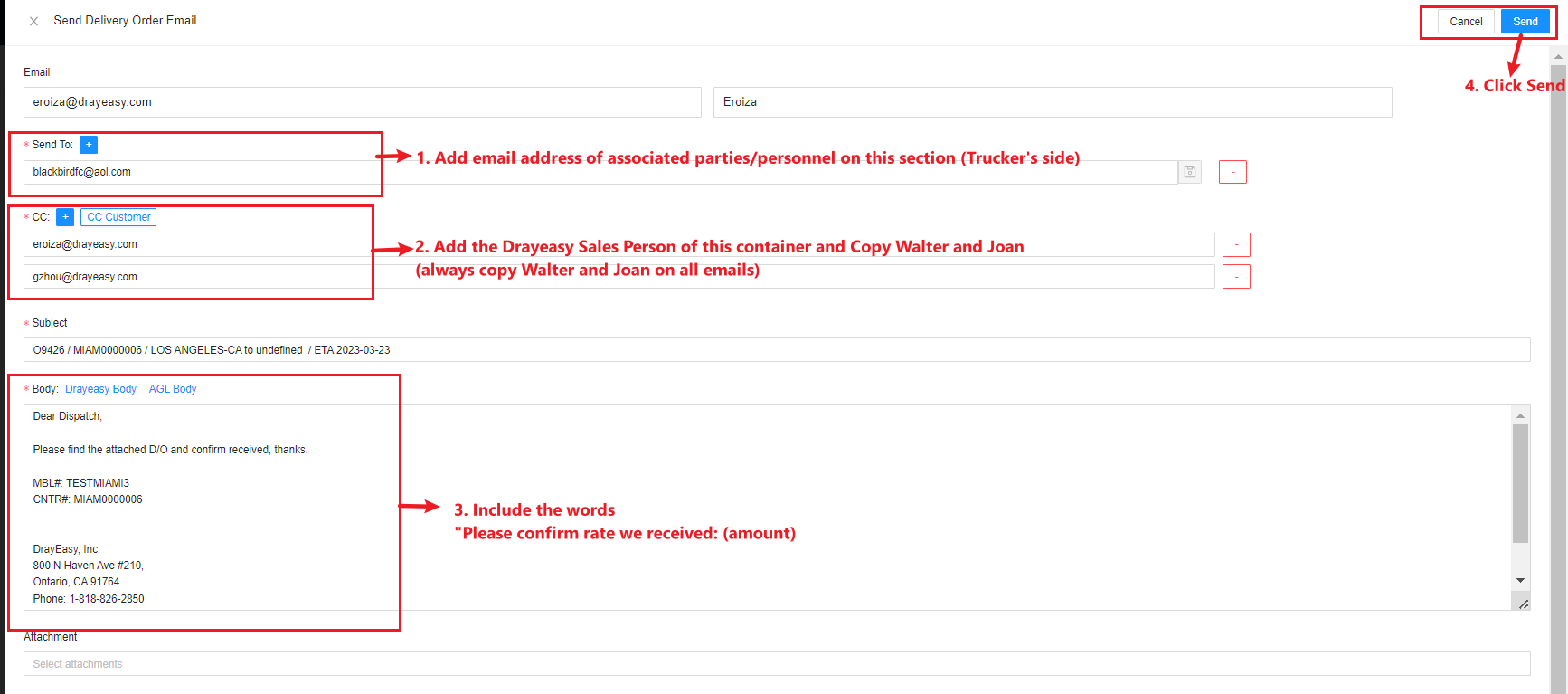 7. Then enter all email address associated for this container and the Rate we received from the Trucker then click Send.