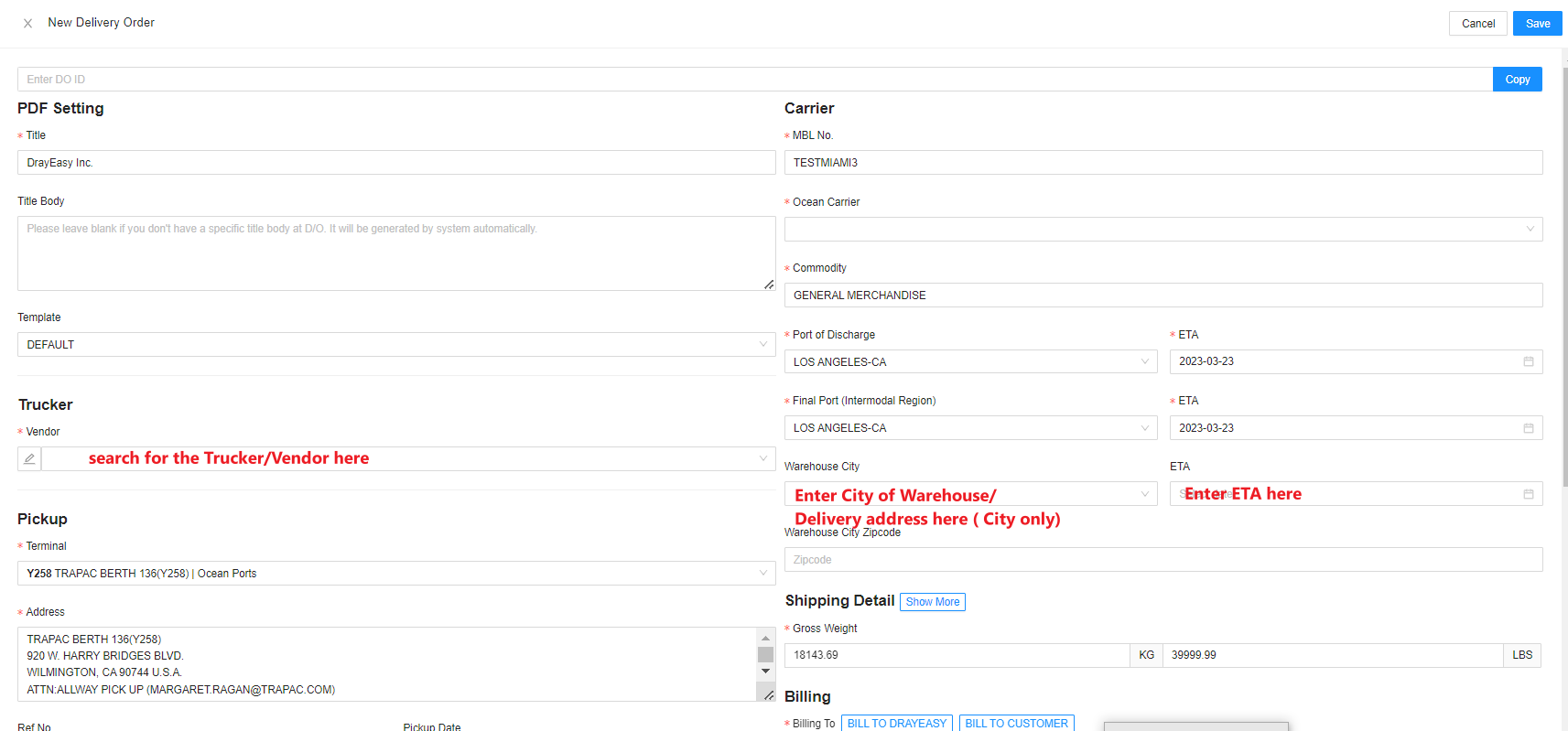 4. Then Enter the Trucker/Vendor you wish to send this DO here. Make sure all information are correct especially the Warehouse Address. Then click Save on the upper right corner of the screen.