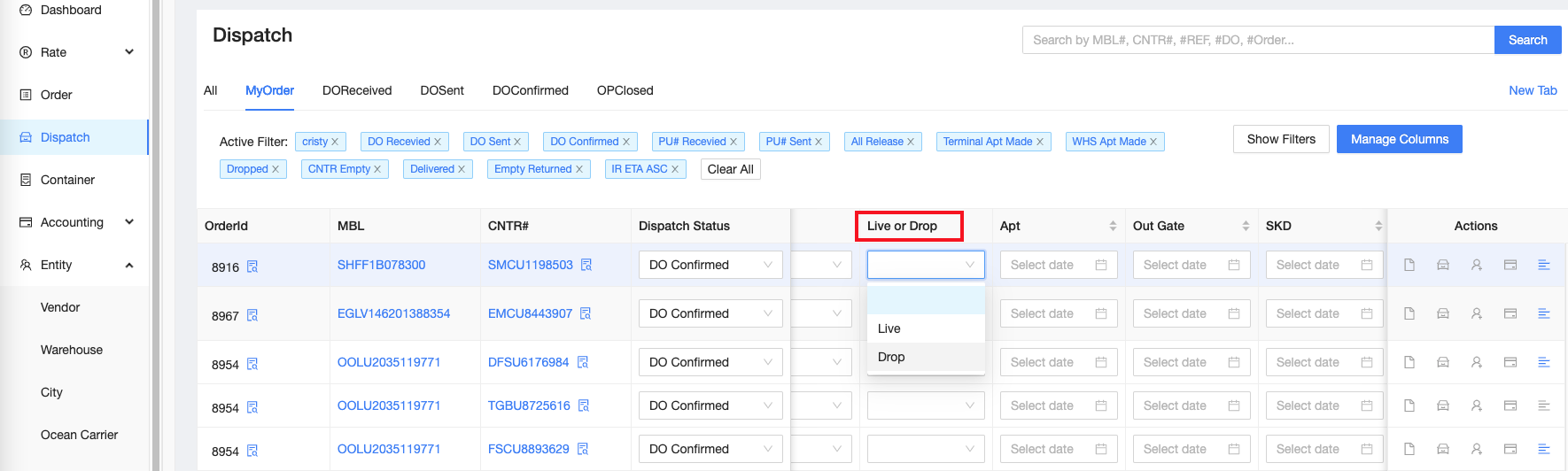 2. Go to Dispatch, find the container no. or order ID, check Live or Drop column and select from the dropdown list whether it is live or drop.