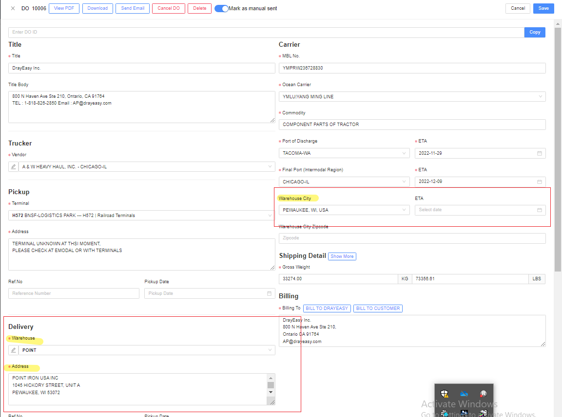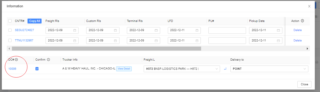 C.2 Go to Order Tab and search the container that you want to edit the warehouse info then click the Little Car icon.