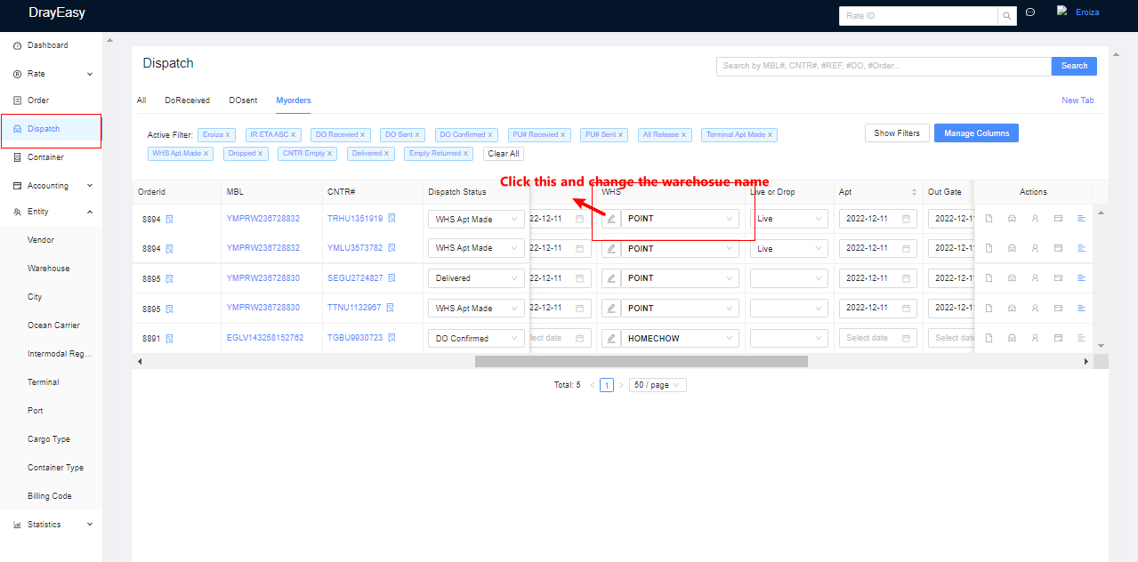 A.2. Go to Dispatch and click the Pencil beside the Warehouse name of your container and change the Warehouse name.