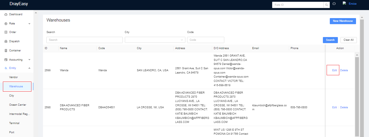 B.2. Go to Warehouse Tab then search for the Warehouse name you wanted to Edit then click Edit.