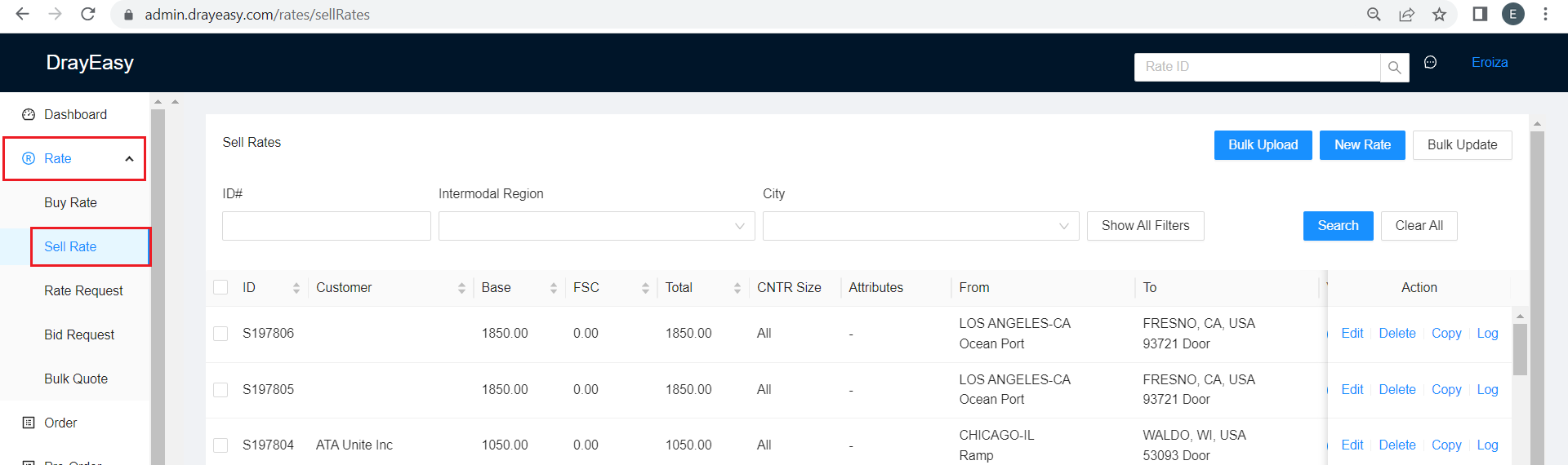 4. Or enter Intermodal Region and City to find a sell rate ID. Then a list of sell rates for that specific location will appear.