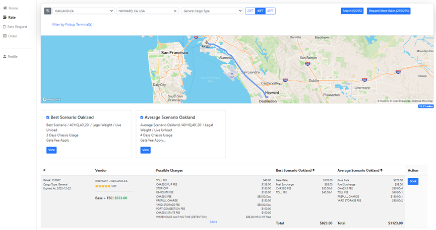 2. Go to Rate and input port/ramp, destination city (need to select from dropoff box) and cargo type.
