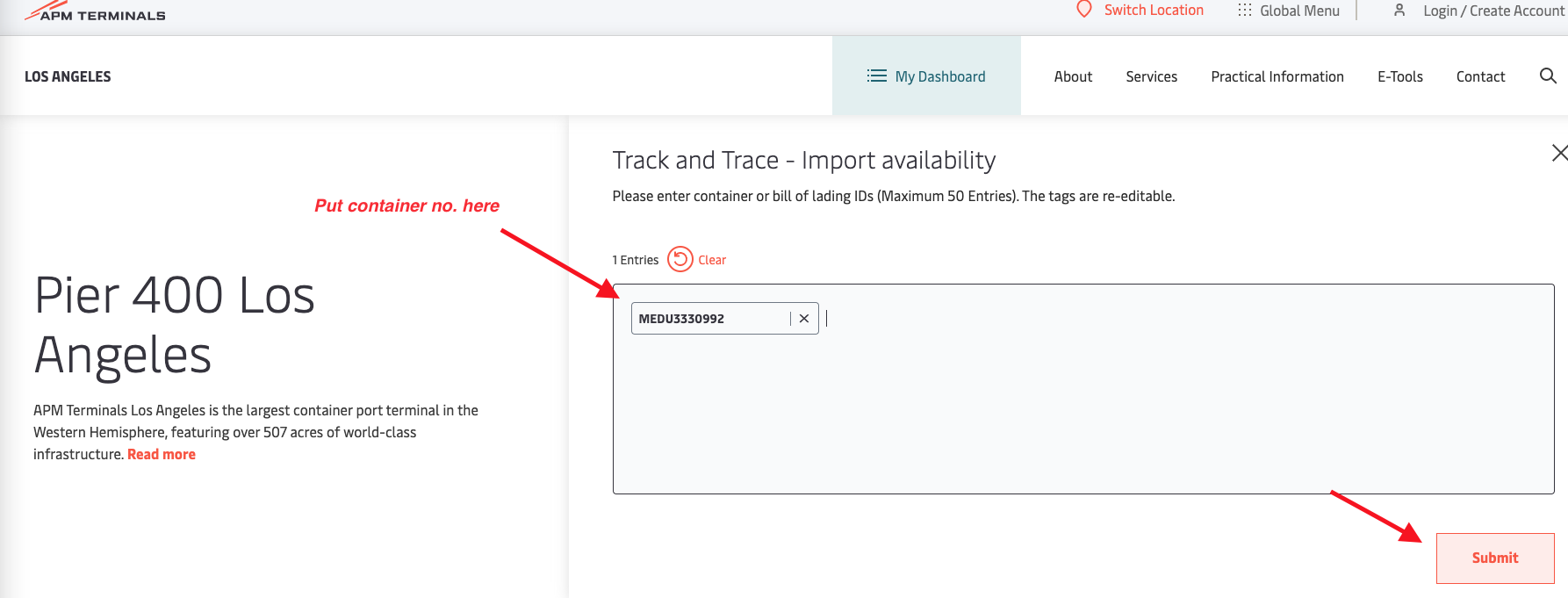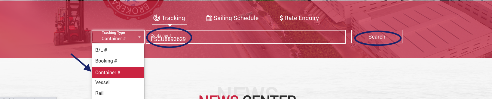 B. Track using container no. -- Click the container no. and terminal log in page will appear.